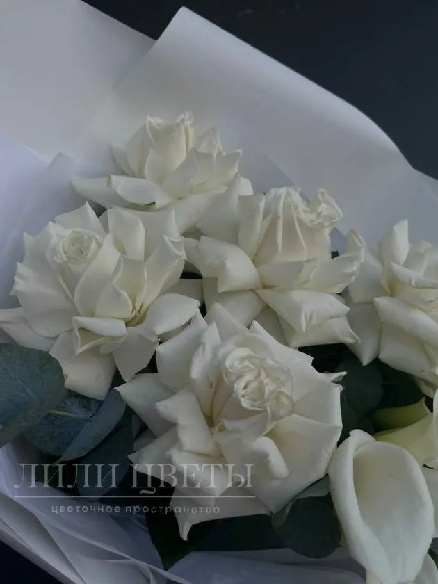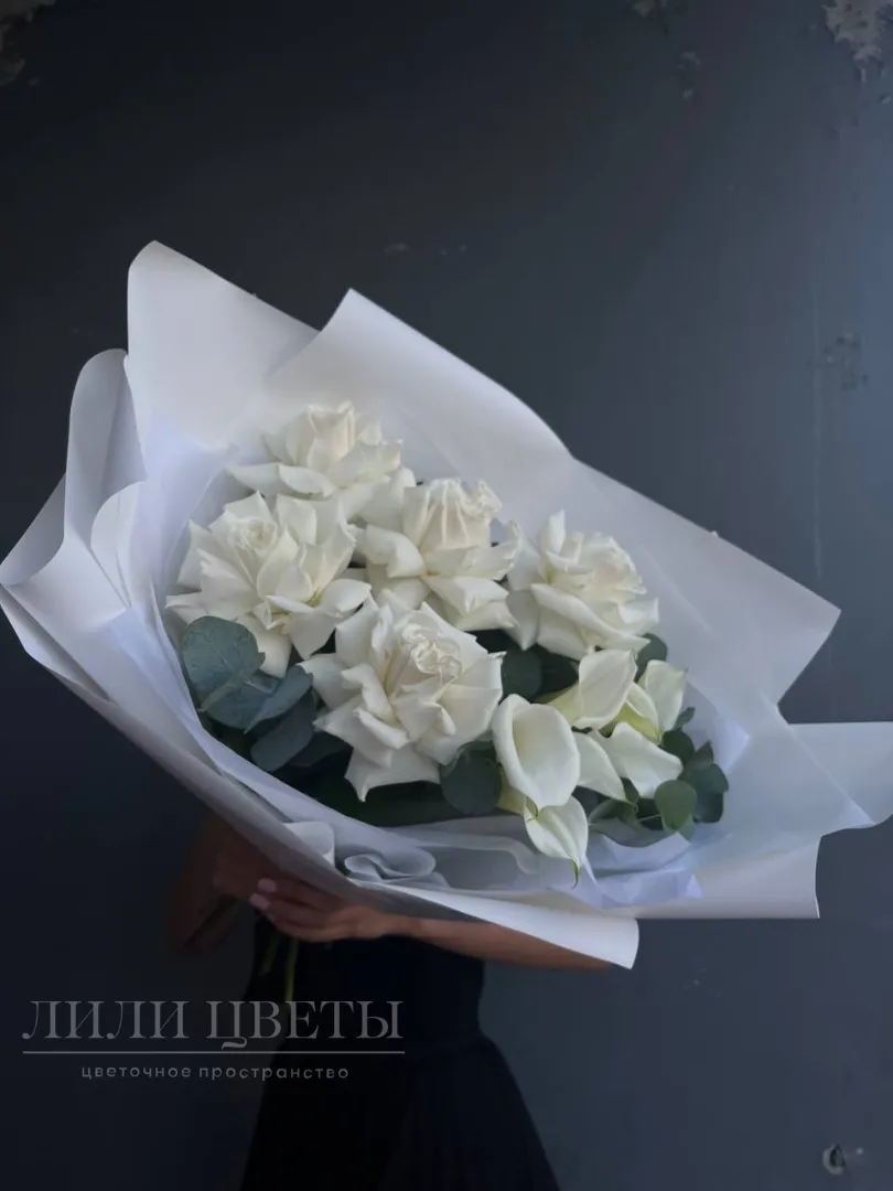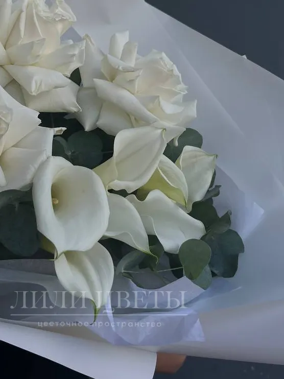 Элегантное сочетание белых калл с ажурными ароматными розами
