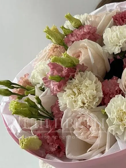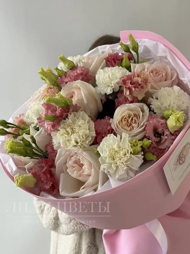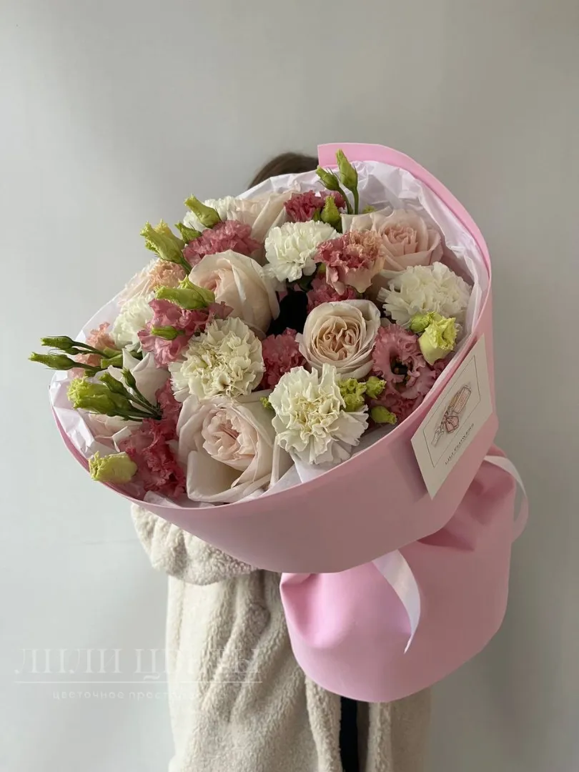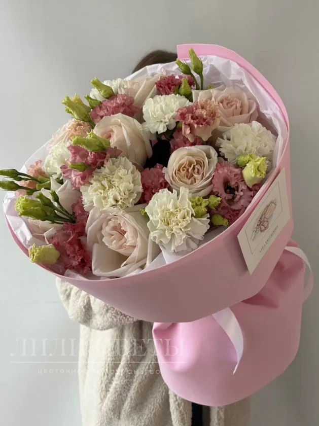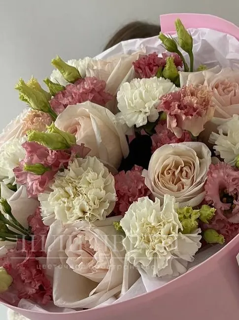 Сборный букет из пионовидных роз, диантусов и эустомы