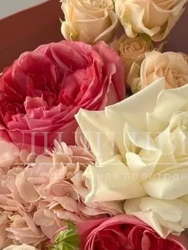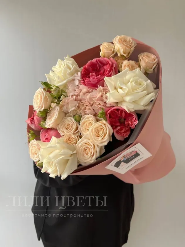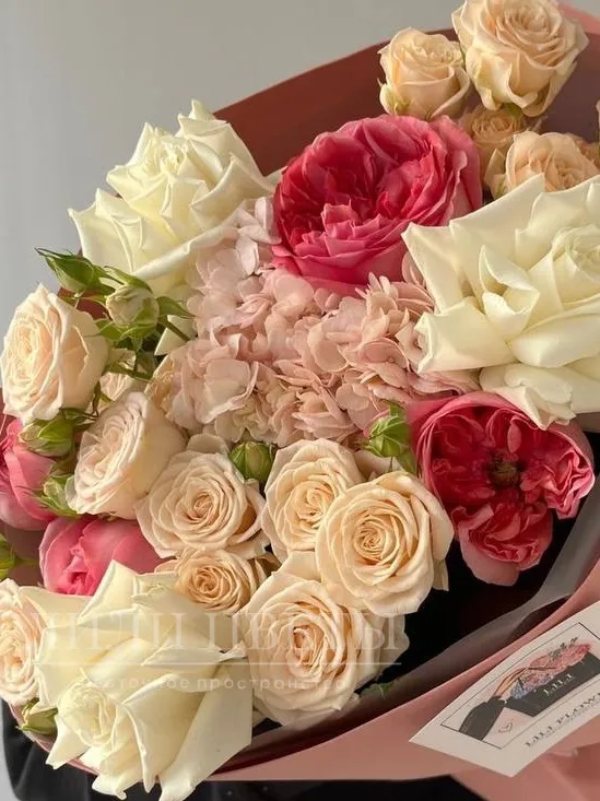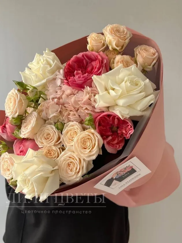 Сборный букет с пионовидными розами и гортензией