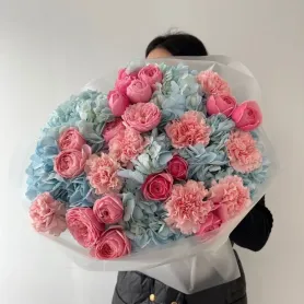 Сборный букет из гортензии, кустовых роз и диантусов