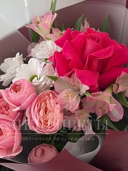 Букет из роз, альстромерий и кустовой хризантемы