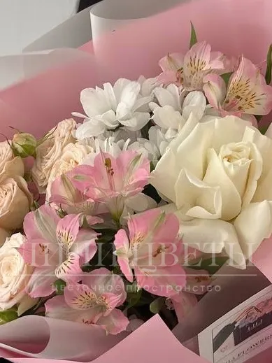 Букет из белой розы, альстромерии, кустовой хризантемы