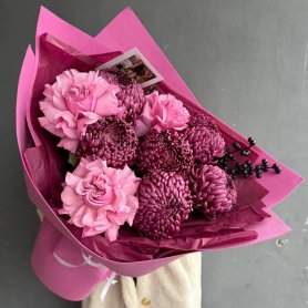 Сборный букет сочетает в себе ажурные розы и яркие одноголовые хризантемы, создавая гармоничное и жизнерадостное произведение искусства. Розы как символ любви, добавляют романтики и изысканности. А яркие и жизнерадостные хризантемы символизируют счастье и долголетие.