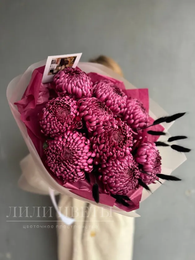 Впечатляющий монобукет состоит из крупных розовых хризантем, создавая эффектное и яркое зрелище. Большие хризантемы, символизируют радость и оптимизм, привлекают внимание своим насыщенным цветом и объемной формой. Букет оформлен в минималистичном стиле, что подчеркивает красоту самих цветов и делает их главной звездой композиции.