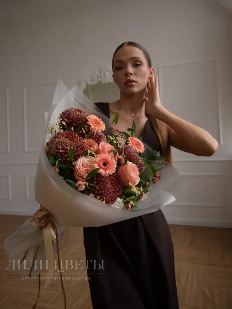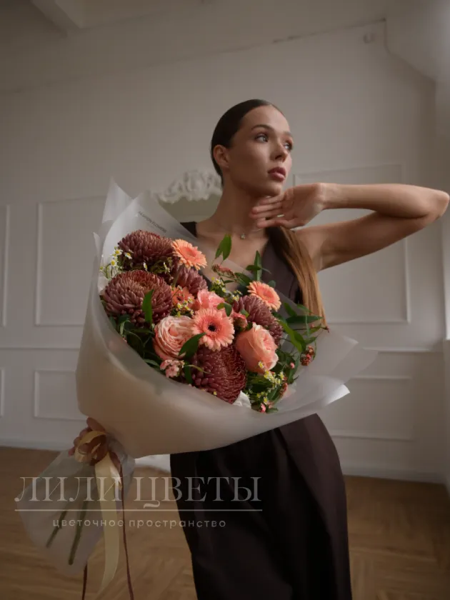 Стильный сборный букет в манящих тонах сочетает в себе герберы, одноголовые хризантемы и пионовидные розы, создавая неповторимую композицию. Яркая и жизнерадостная гербера добавляет нотку игривости и свежести. Элегантная и объемная, хризантема символизирует счастье и радость, прекрасно дополняя общий замысел букета. Пионовидная роза придает букету романтический акцент и изысканность.