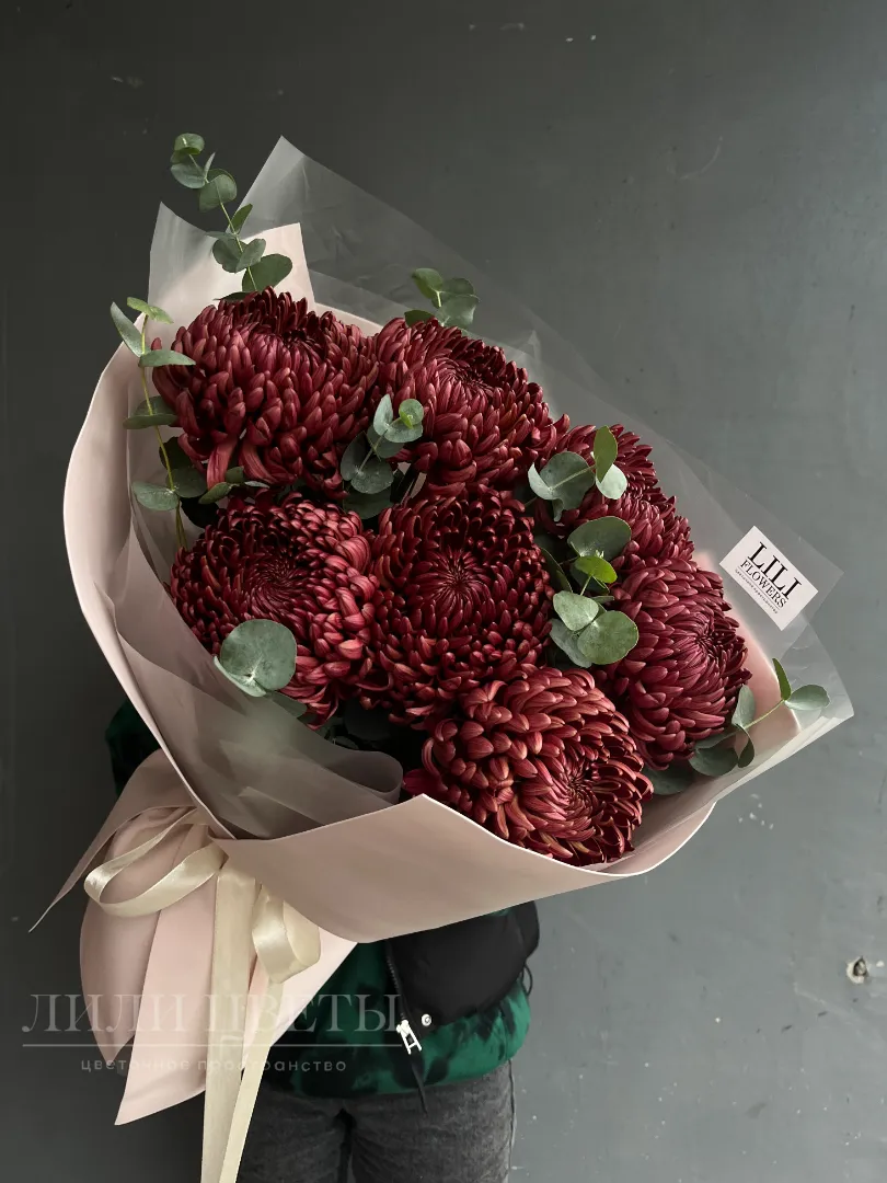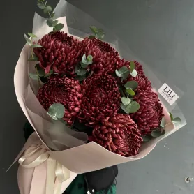 Этот великолепный монобукет из одноголовых бордовых хризантем представляет собой истинное произведение искусства. Каждая хризантема выделяется своим насыщенным бордовым оттенком, символизируя страсть, элегантность и утонченность. Букет оформлен в минималистичном стиле, что позволяет каждому цветку раскрыться во всей своей красе. Хризантемы создают глубокий и насыщенный акцент, привлекая внимание и наполняя пространство теплом и уютом.