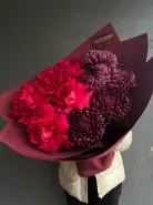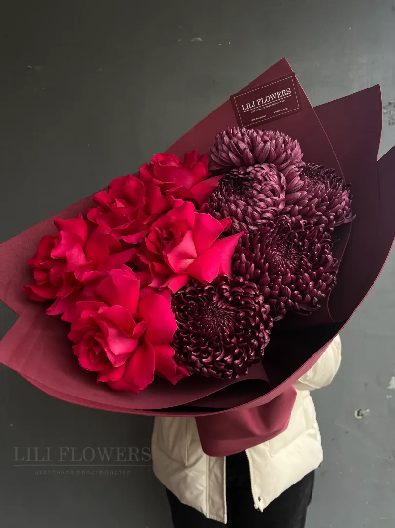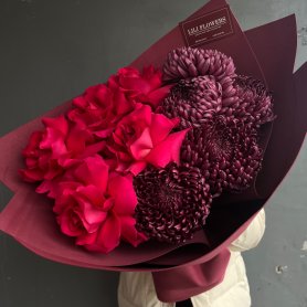 Сборный букет сочетает в себе нежные ажурных роз и крупные одноголовые хризантемы, создавая гармоничную композицию, полную романтики и утонченности. Ажурные розы, с их воздушной структурой и мягкими лепестками, символизируют любовь, благодарность и тепло, придавая букету легкость и воздушность. В сочетании с элегантными хризантемами, которые добавляют композиции стабильности и изящества, получился гармоничный и выразительный подарок.