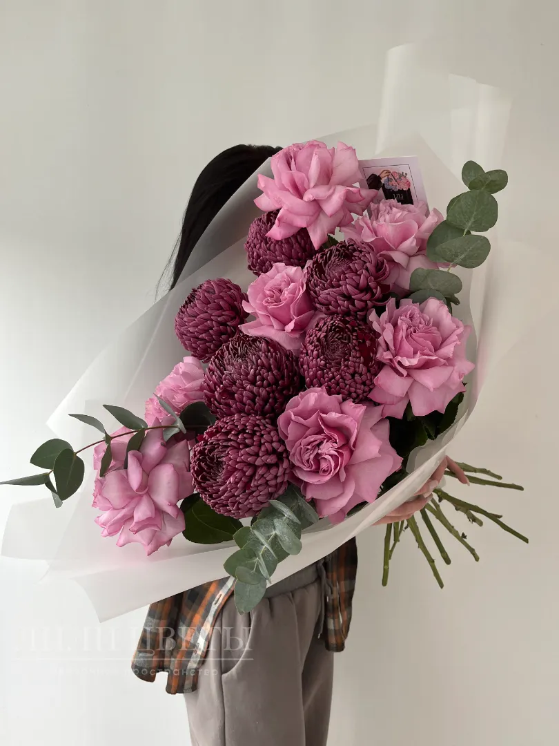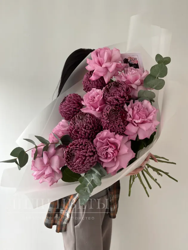 Необычный букет объединяет в себе нежные ажурные розы и элегантную одноголовую хризантему, создавая стильную и романтичную композицию. Ажурные розовые розы с воздушными, легкими лепестками символизируют любовь, благодарность и искренние чувства, придавая букету мягкость и утонченность. Яркие и крупные хризантемы добавляют структуре букета изящество, он выглядит гармонично и свежо.