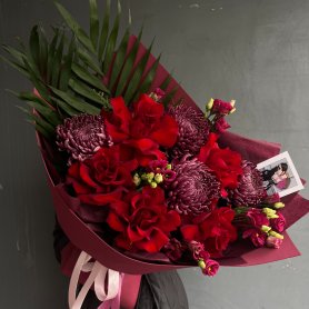 Элегантный сборный букет гармонично сочетает в себе нежность и утонченность каждого цветка. В его составе четыре одноголовые хризантемы - наш хит сезона, который символизируют собой спокойствие и гармонию, пять ажурных роз наполняют букет яркими впечатлениями и придают ему роскошность своим цветом, искрящиеся эустомы создают воздушность и легкость, а два нежных папоротника добавляют в общую композицию природную красоту, свежесть и живость.