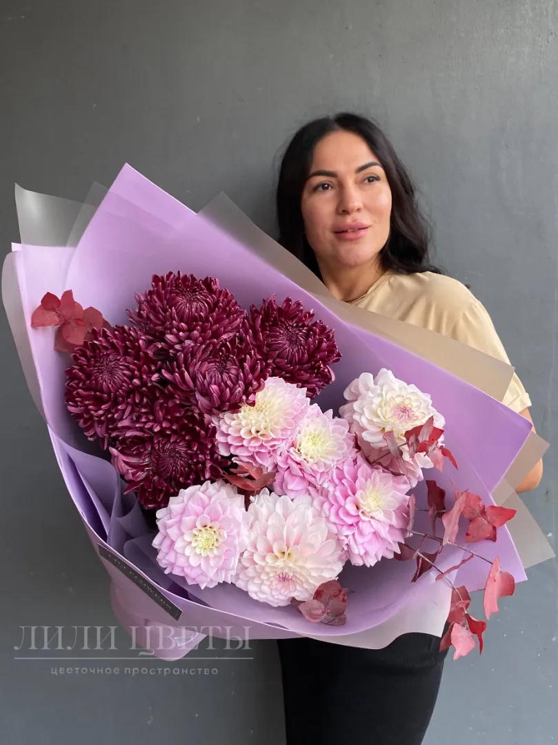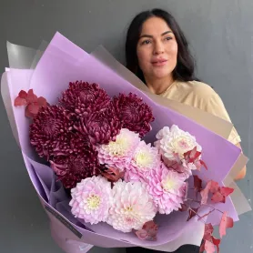 Дуо-букет сочетает в себе элегантность и природную свежесть. В его составе одноголовые хризантемы, символизирующие собой спокойствие и гармонию жизни, светлые оттенки георгина привлекают внимание своей насыщенной красотой и приятным чистым оттенком. Дополняют композицию два стабилизированных эвкалипта, придающих букету особую текстуру и свежий аромат, создавая ощущение легкости и природной гармонии.
