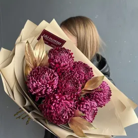 Букет из одноголовых ярких хризантем и интересным украшением в виде золотого рускуса погружает в мир природной элегантности и при этом очень гармонично сочетается с представленной упаковкой. Яркие, насыщенные цветы словно оживают в объятиях нежных, ароматных веточек, наполняя пространство теплом и уютом. Крупные хризантемы как символ радости и красоты. В свою очередь рускус добавляет изысканную текстуру, превращая цветочную композицию в настоящее украшение интерьера.