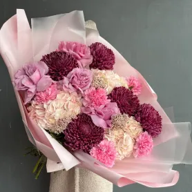Удивительный сборный букет сочетает в себе одноголовую хризантему, гортензию, ажурные розы, диантусы и озотамнус, создавая настоящую симфонию цветов и текстур. Крупная хризантема с насыщенными лепестками служит ярким акцентом, привлекая внимание своей выразительностью. Гортензия своими пышными соцветиями в нежных оттенках создает объем и глубину. Эти цветы, словно облака, наполняют букет мягкостью и романтикой, придавая ему утонченный вид. Ажурные розы с изысканными лепестками добавляют элегантности и шарма. Их деликатные цвета прекрасно сочетаются с другими элементами, создавая гармонию. Диантусы известны своей насыщенной текстурой и ароматом, придают букету уют и теплоту. Озотамнус завершает этот великолепный ансамбль добавляя легкости. Его мелкие белые цветочки создают эффект снежного покрова, подчеркивая красоту остальных цветов.