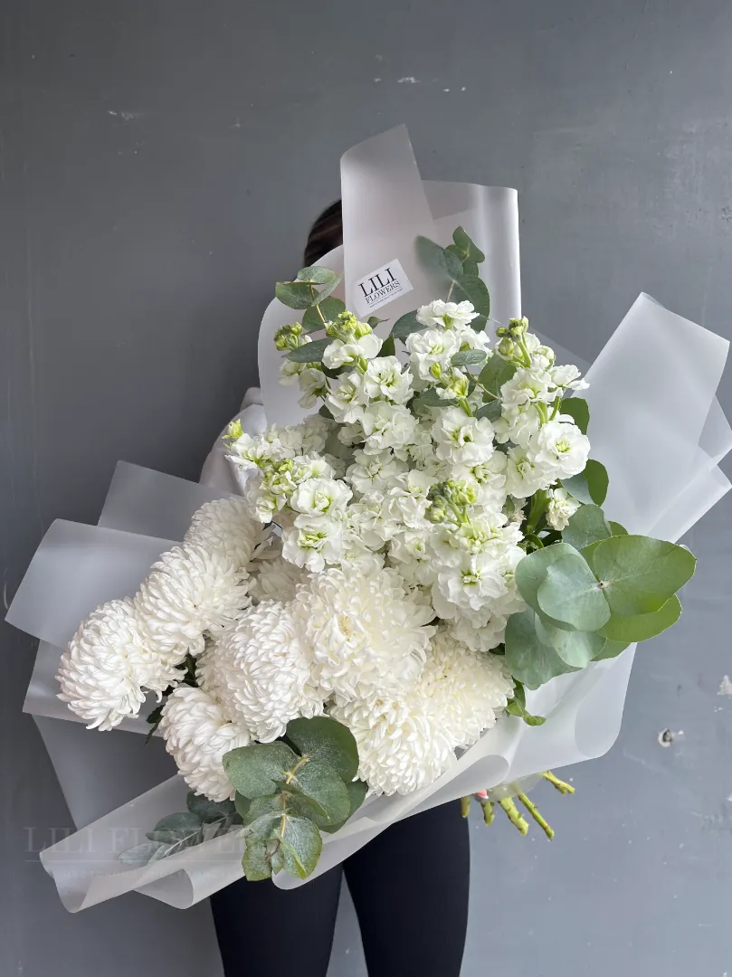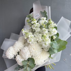 Букет как воплощение чистоты и элегантности, созданное из нежной маттиолы и изысканных хризантем. Цветы, словно свежий снег, наполняют пространство светом и гармонией, создавая атмосферу умиротворения и красоты. Маттиола придает букету романтичность и утонченность. Каждая цветочная головка словно шепчет о нежности и любви, добавляя в композицию нотку волшебства. Хризантемы яркой и выразительной формы создают контраст и динамику, наполняя композицию жизненной энергией.