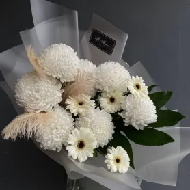 Завораживающее сочетание цветов, которое переносит нас в мир загадочности и утонченной красоты. Этот букет словно создан для того, чтобы подчеркнуть элегантность и стиль, идеально подходя для особых случаев или как яркое украшение интерьера. Хризантемы их пышными, белоснежными лепестками символизируют чистоту и искренность. Герберы добавляют в букет живость и радость, их яркие цвета и крупные формы создают эффектный контраст с нежностью хризантем. Аралия и искусственные перья завершают этот великолепный ансамбль, придавая букету легкость и воздушность. Они словно танцуют на ветру, добавляя нотку романтики и загадочности.