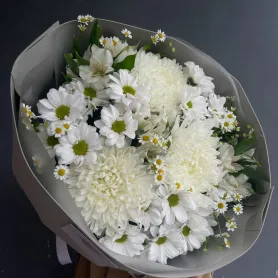 Сборный букет из белых цветов наполняет пространство светом и радостью. Составленный из нежных хризантем, милых ромашек и дополненный гармоничными акцентами, этот букет олицетворяет простоту и красоту природы. Цветы символизируют чистоту, искренность и беззаботность, напоминая о теплых летних днях и безмятежных моментах счастья. Их простота и естественность делают букет универсальным подарком для любого случая.