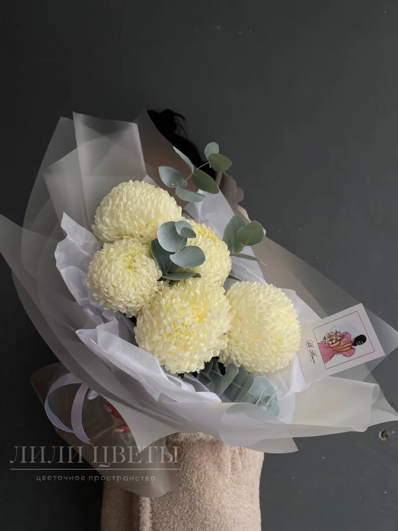 Букет из белых одноголовых хризантем выглядит так, словно сама природа решила подарить нам частичку своего волшебства, добавляя особый шарм и уют в сочетании с эвкалиптом. Эффектный акцент, который завораживает своей красотой и изяществом.