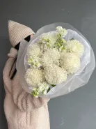 Букет притягивает взгляды и наполняет пространство атмосферой свежести и радости. Собранный из нежных маттиол и пышных хризантем - букет станет прекрасным подарком для любого случая, будь то праздник, день рождения или просто знак внимания. Маттиола со своим чарующим ароматом добавляет изысканности, а крупная хризантема создает ощущение легкости и воздушности.