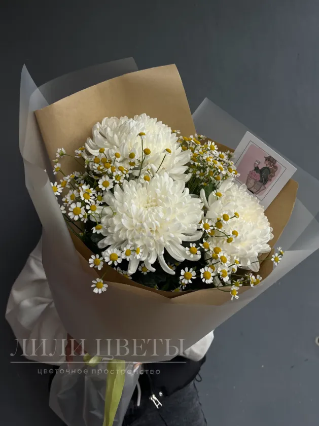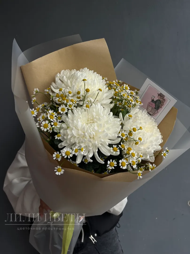 Нежный букет из маленьких ромашек и одноголовой хризантемы символизирует простоту