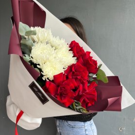 Дуо букет сочетает в себе красные розы и белые хризантему, создавая гармоничное и стильное произведение искусства. Ажурные розы символизируют страсть и любовь, их бархатистые лепестки привлекают внимание и наполняют атмосферу романтикой. Одноголовая хризантема добавляет свежести и легкости. Эвкалипт завершает композицию, внося нотку элегантности с его нежными зелеными листьями, подчеркивая красоту цветов.