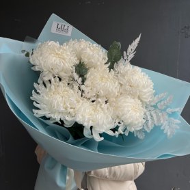 Белые цветы в голубом оформлении - истинное воплощение элегантности и простоты. Составленный исключительно из белоснежных хризантем, он притягивает взгляд своим чистым и свежим видом. Каждый цветок словно олицетворяет зимнюю сказку, наполняя пространство легкостью и гармонией. Отлично подойдет для любого случая: от торжеств до уютных вечеров в кругу близких. Нежный аромат и утонченная форма создают приятную атмосферу, становясь прекрасным подарком для тех, кто ценит красоту и стиль.