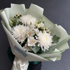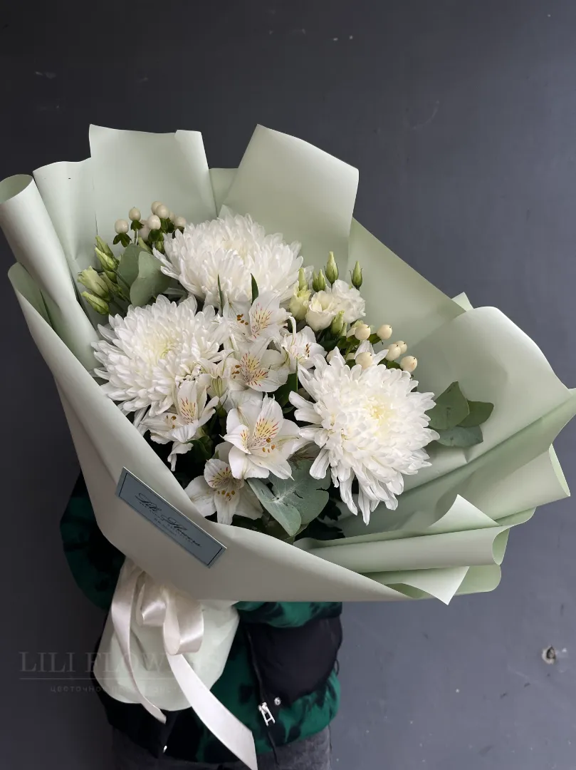 Яркий и многослойный букет создает удивительную симфонию цветов и текстур. Альстромерии с их яркими оттенками привносят жизнерадостность, а хризантемы добавляют элегантности. Нежные эустомы с бархатистыми лепестками придают букету романтичный шарм. Эвкалипт обрамляет композицию свежестью, а гиперикум вносит уникальные акценты.