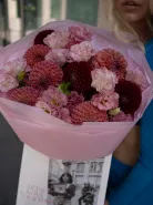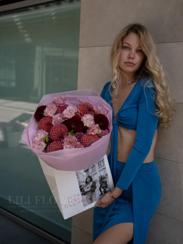 Изысканные цветы которые пленяют своей красотой и стильным сочетанием. Нежные эустомы с их бархатистыми лепестками и утонченными оттенками создают романтическое настроение, в то время как яркие георгины добавляют динамику и объем. Этот букет словно воплощает в себе летнюю свежесть и тепло, идеально подходя для подарка на любой праздник или просто для поднятия настроения. Букет станет символом внимания и заботы, наполняя каждый день яркими эмоциями и радостью!