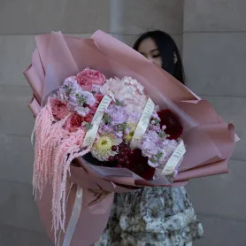 Произведение цветочного искусства, воплощающее динамику и изящество природы. В его составе преобладают роскошные георгины насыщенных оттенков и свежая маттиола. Обильное и пышное расположение цветов и декора создает эффект водопада. Этот букет идеально подойдет для тех, кто ценит яркость, выразительность и оригинальность. Он станет замечательным подарком на особый случай или ярким украшением интерьера, создавая атмосферу свежести, энергии и природной красоты.