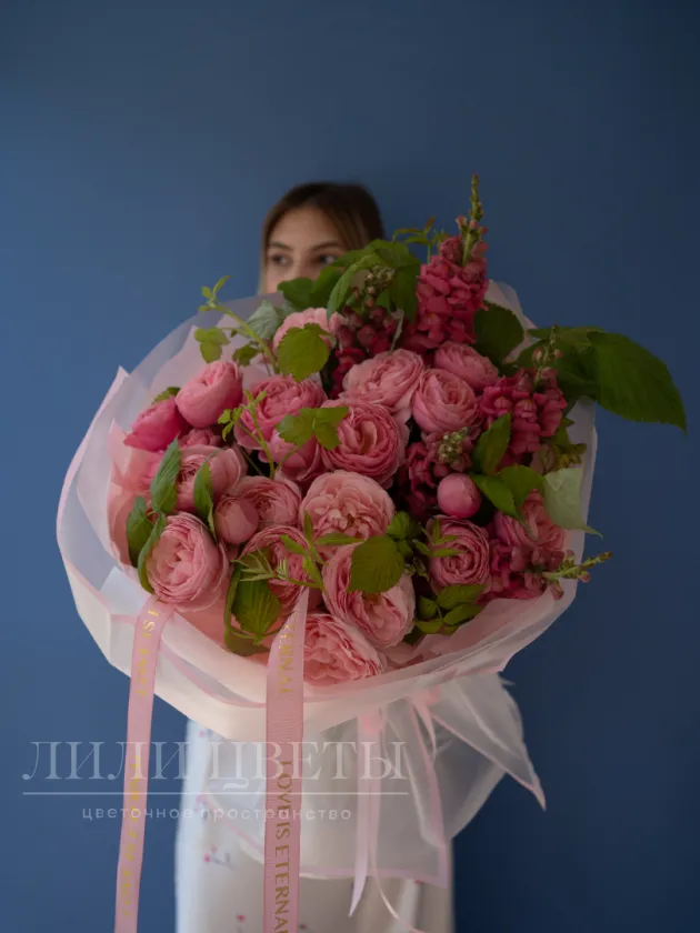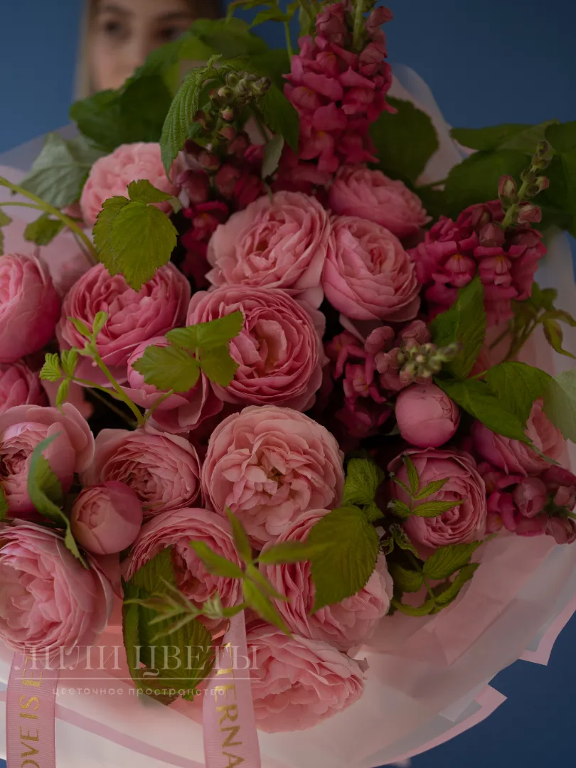 Роскошный букет в нежных розовых оттенках из пышных кусовых роз. В его композицию добавлены яркие цветы антирринума, придающие букету выразительность и глубину. Нежные веточки малины дополняют гармонию, добавляя свежести и ароматности. Идеальный подарок для тех, кто ценит элегантность, нежность и яркие эмоции. Букет подчеркнет особый момент и окутает теплою атмосферой.