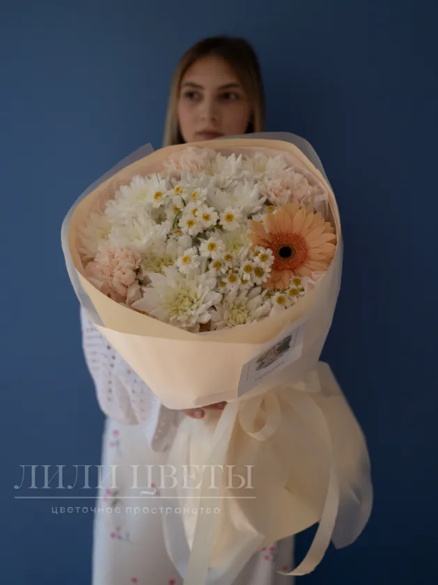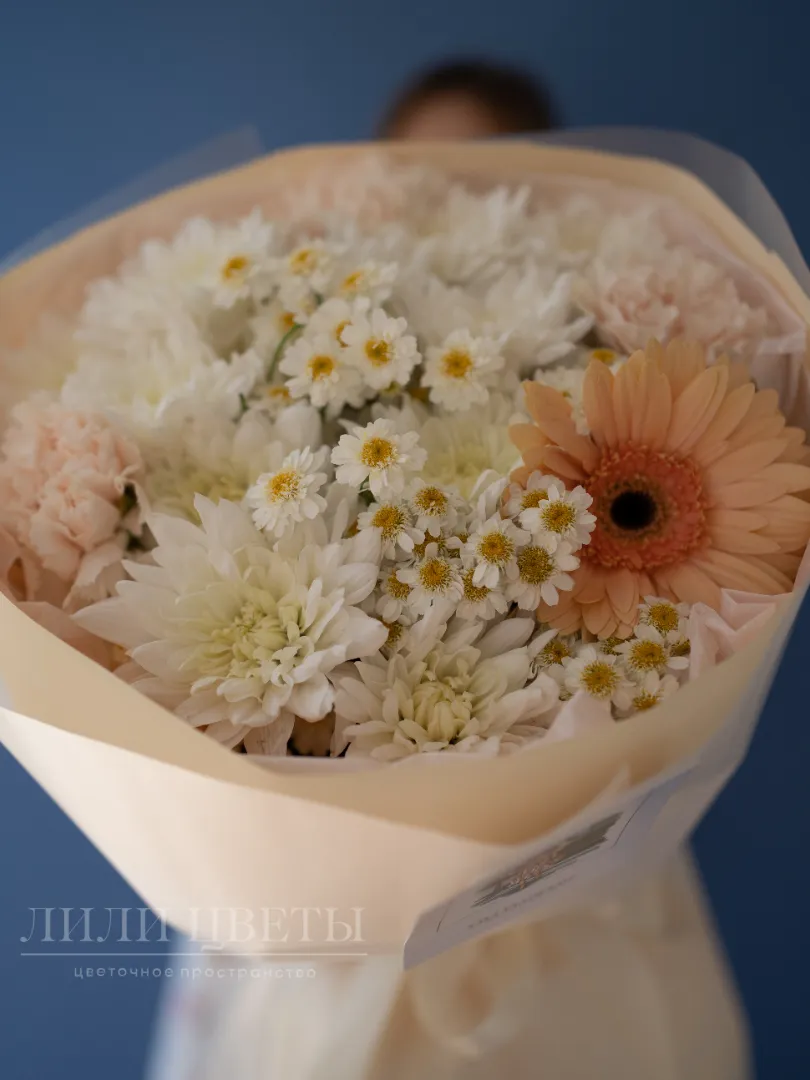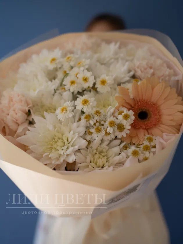 Легкий букет в гармоничных бело-молочных тонах создает ощущение свежести и радости. В его составе присутствуют красивые ромашки, как символ нежности и искренних чувств, яркие герберы символизируют тепло и оптимизм, изящный танацетум, добавляющий воздушности и нежности, а также богатые хризантемы, олицетворяющие вечность и стабильность. Такой букет идеально подойдет для поздравлений, подчеркнет особый момент и порадует любого получателя своей красотой и гармонией. Он станет ярким акцентом, наполняя сердце теплом и светом.
