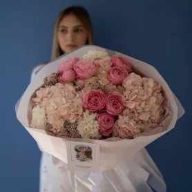 Сборный букет сочетает в себе крупные и пышные гортензии, символизирующую искренность чувств, изящные кустовые розы, олицетворяющие нежность и заботу, а также три выразительных диантуса, добавляющих объема и яркости. Такой букет станет прекрасным подарком на особый случай и создаст атмосферу уюта и тепла. Его воздушность и богатство красок обязательно поразят получателя.
