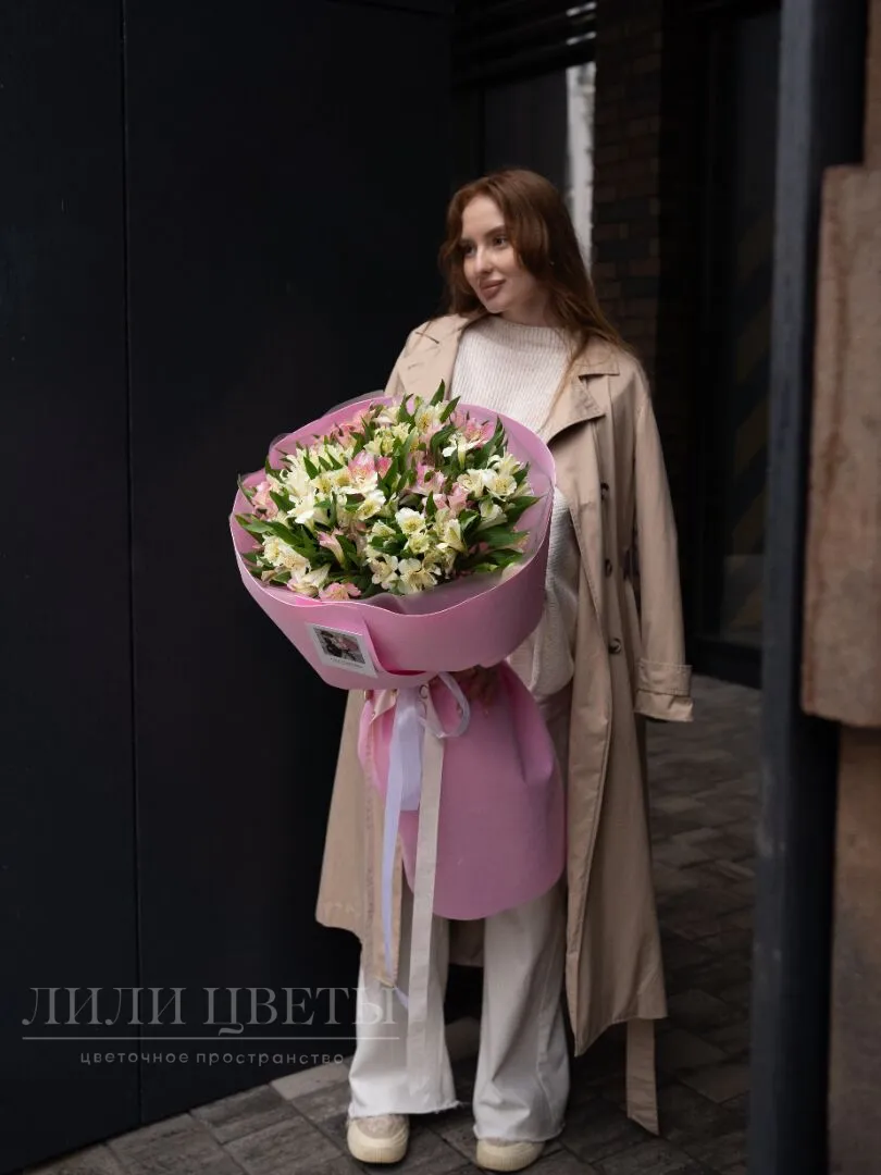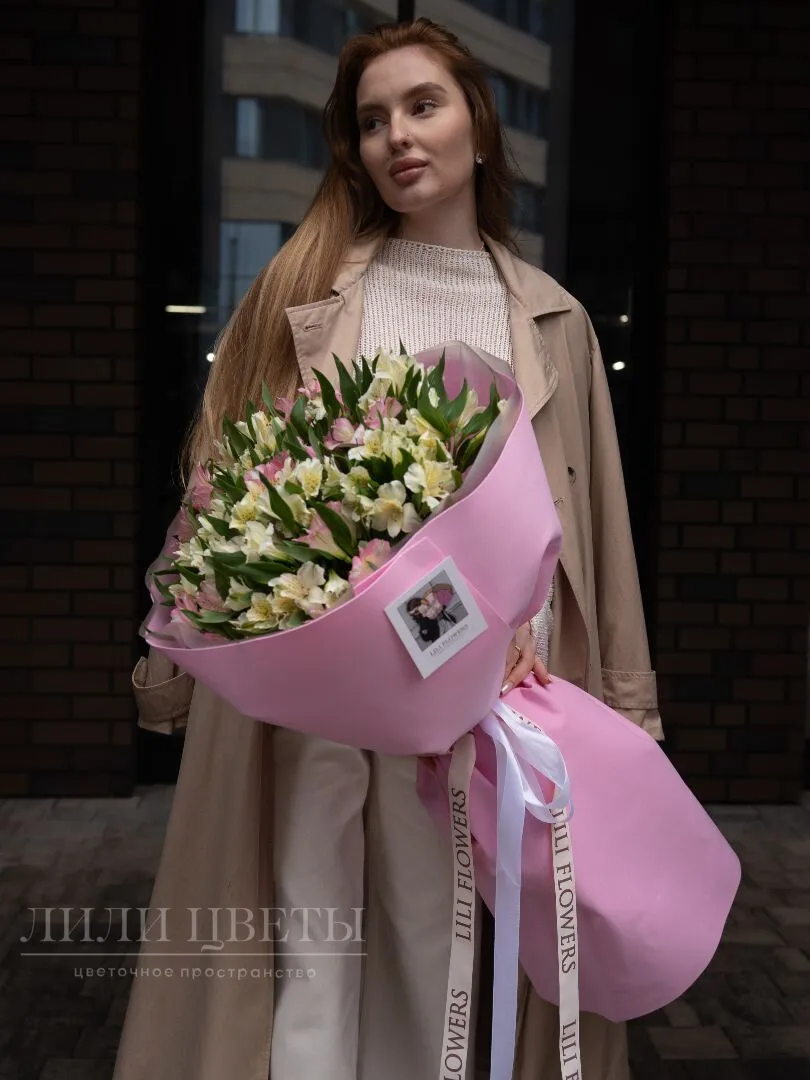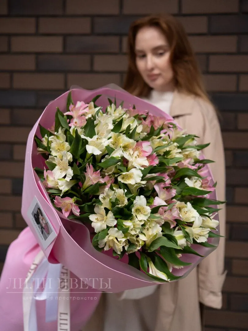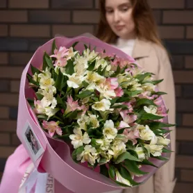 Утончённый букет из белых и розовых альстромерий излучает элегантность и нежность. Белые альстромерии символизируют чистоту и искренность, а розовые добавляют мягкость и романтичность. Цветы гармонично сочетаются, создавая ощущение лёгкости и воздушности. Изящная зеленью в букете подчеркивает свежесть композиции. Идеальный подарок для выражения любви, благодарности или просто для поднятия настроения, он подчеркнет особенность каждого момента.
