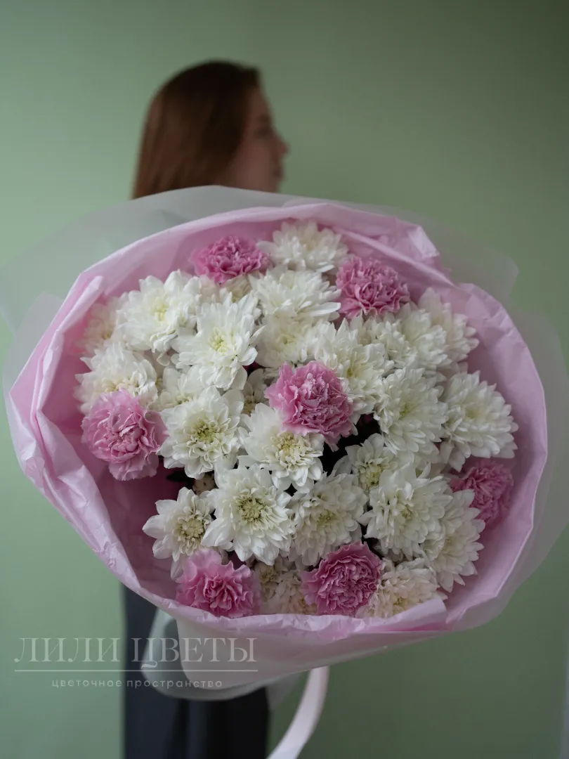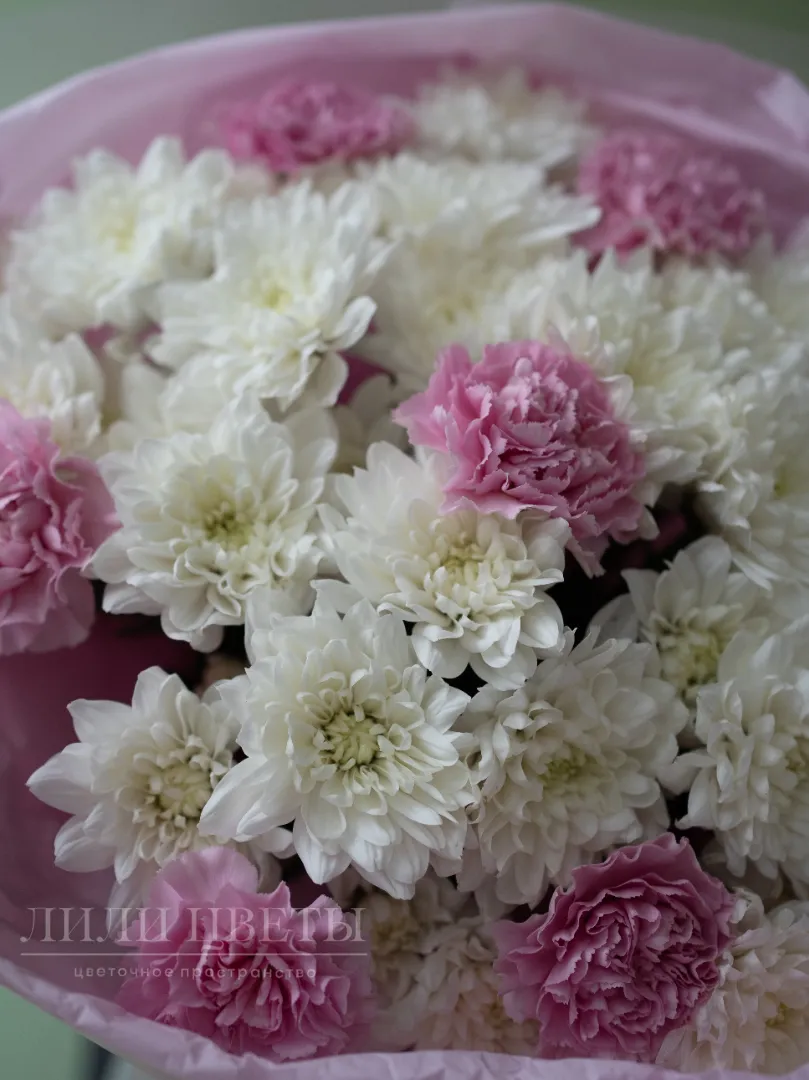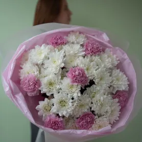 Букет сочетает в себе нежность и элегантность. Розовые хризантемы символизируют любовь и заботу, в то время как белые диантусы олицетворяют чистоту и свежесть. Вместе они создают гармоничное сочетание, которое привлекает внимание и дарит радость. Букет имеет пышную, округлую форму, цветы придают ему объём и изысканность. Лёгкий, нежный аромат диантусов прекрасно дополняет свежесть хризантем. Букет станет отличным подарком для различных мероприятий: от свадеб и юбилеев до простого выражения благодарности или поддержки.