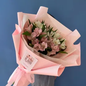 Чудесный букет из альстромерий - символ дружбы и радости. Яркие и разнообразные оттенки этих цветов создают жизнерадостный и праздничный вальс цветов, который поднимет настроение в любой ситуации. Альстромерии своей уникальной формой привносят свежесть и экзотику. Такой букет станет прекрасным подарком для близких, украсит любой интерьер и создаст атмосферу тепла и уюта, даря положительные эмоции и радость.