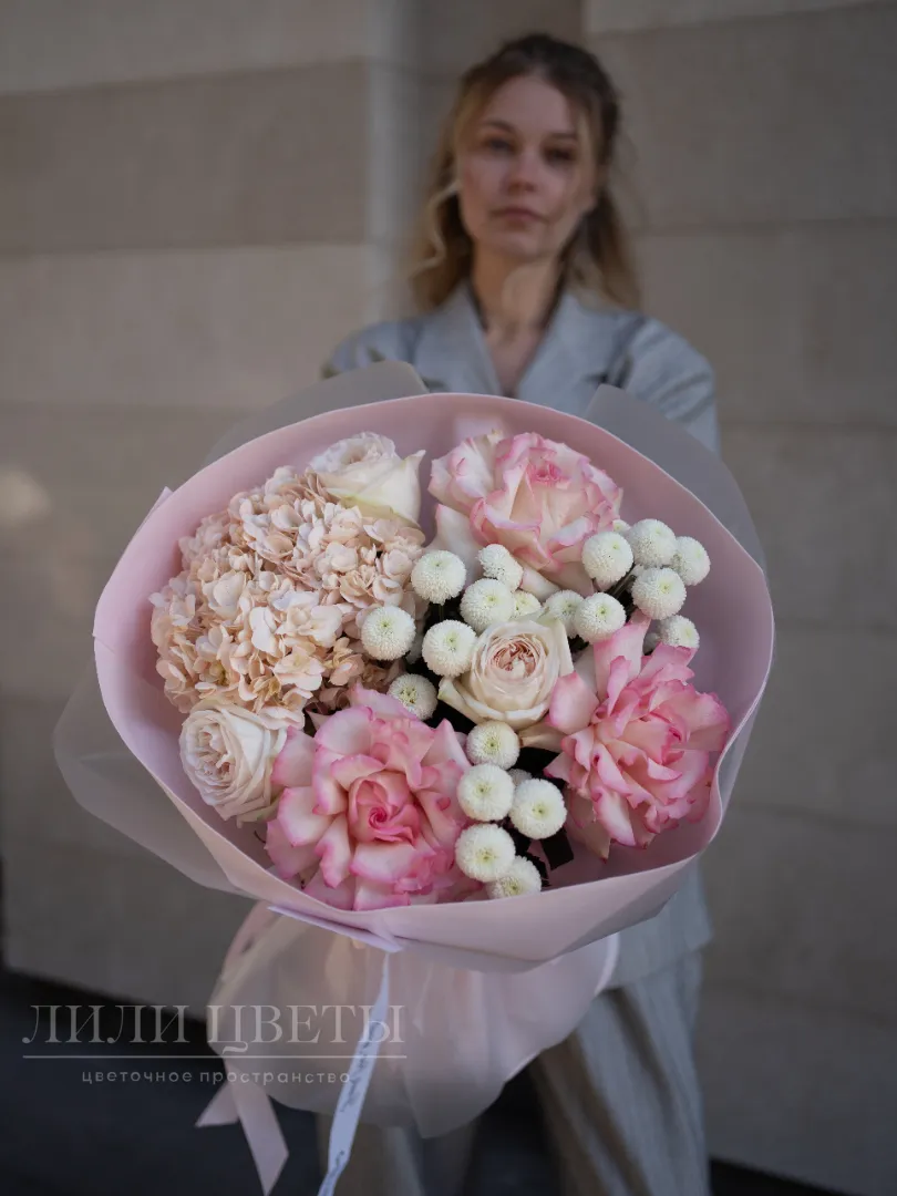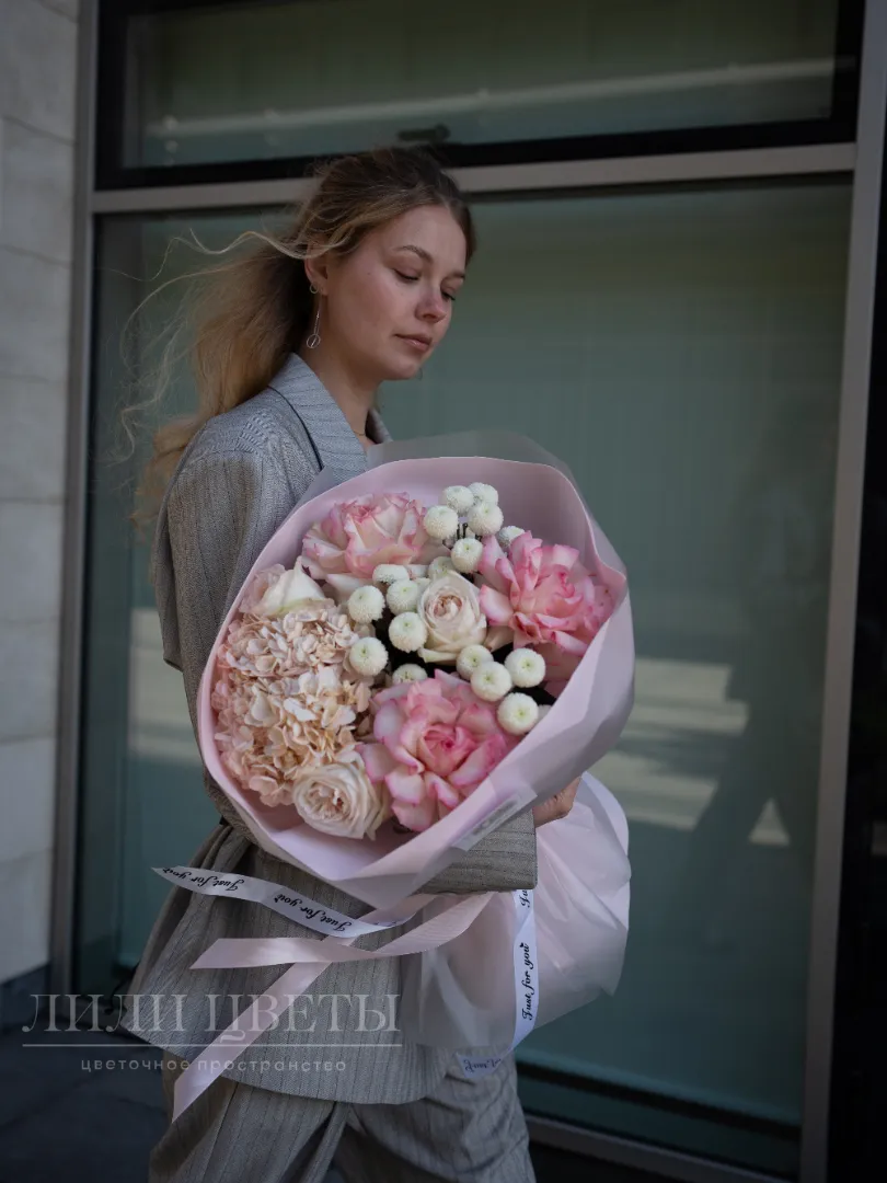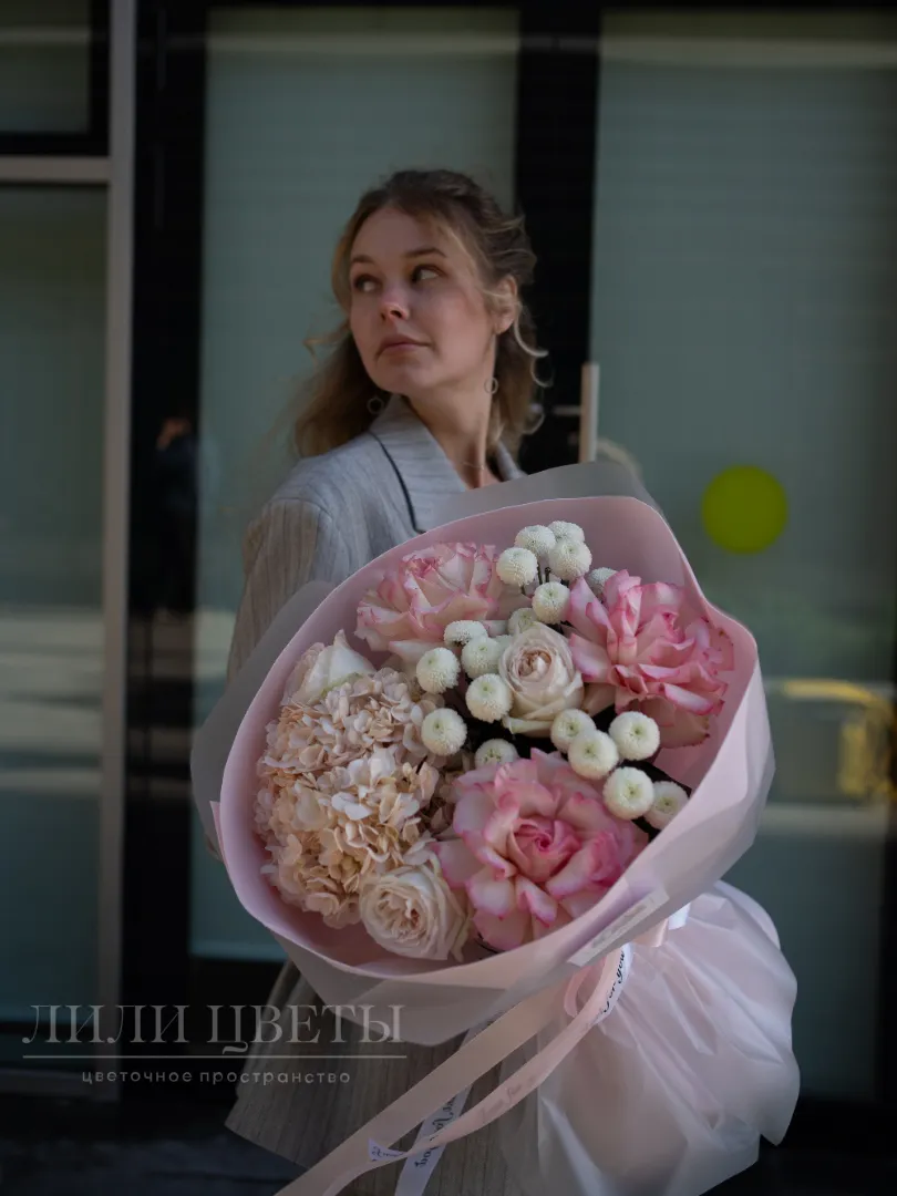 Нежные и жизнерадостные оттенки в этом букете будто наполняют пространство теплом солнечного света. Он станет идеальным подарком для тех, кто любит радоваться жизни и делиться положительными эмоциями. Сочетание гортензии, роз и сантини создают атмосферу праздника и поднимает настроение. Быстрая доставка по городу и эффектный внешний вид непременно порадует получателя!
