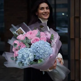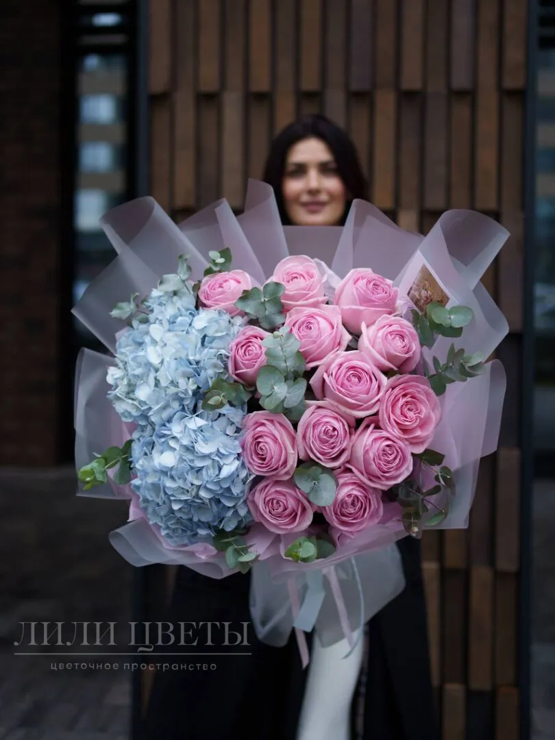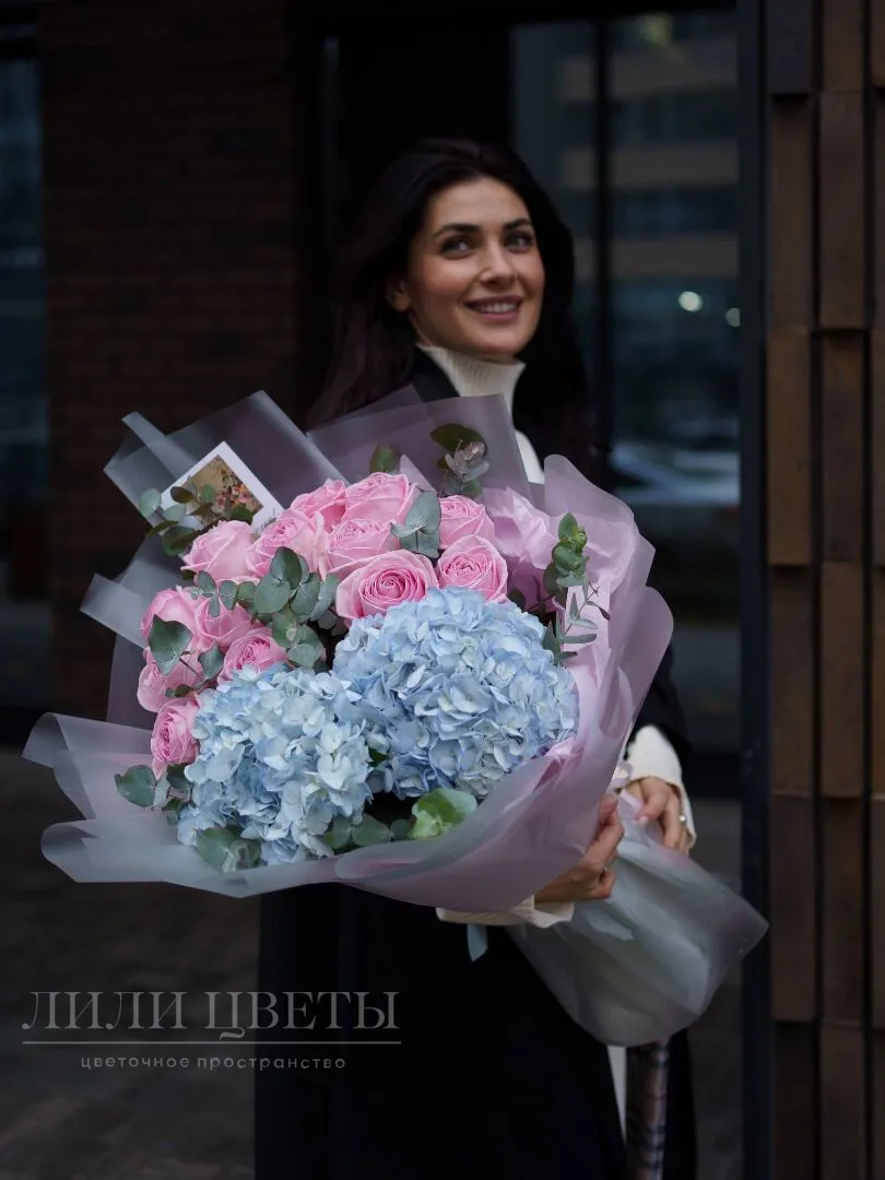 Изысканное сочетание цветов! Букет отлично подходит для особых случаев и способен подчеркнуть важность любого события. Голубая гортензия создаёт объем и нежность, добавляя воздушность композиции. Нежные розы и листья эвкалипта приносят свежесть и аромат, делая букет ещё более привлекательным. Благодаря правильной композиции, букет сохраняет свою красоту надолго. Прекрасным подарок для тех, кому важна искренность и красота.