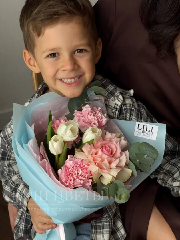 Подарите радость и тепло с милым букетом, наполненным изысканными тюльпанами, нежными диантусами, ажурной розой и ароматным эвкалиптом. Этот нежный небольшой букет станет идеальным подарком на День Матери, а так же в качестве сюрприза. Порадуйте близких красивым и нежным подарком, создающим атмосферу уюта и любви.