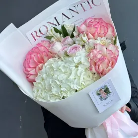 Очаровательный сборный букет станет идеальным выражением ваших чувств и создаст особую атмосферу в любом интерьере. В его составе изящная гортензия, которая придает букету объем и нежность. Ажурные розы добавляют романтичности, а кустовая роза создает гармоничный акцент. Альстромерия придает композиции изящную нотку элегантности и свежести. Этот букет отлично подойдет для поздравлений, романтических признаний или просто для того, чтобы украсить ваш день. Удобная доставка и возможность заказать букет прямо сейчас делают покупку максимально комфортной!