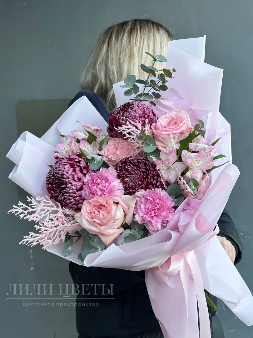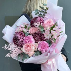 Изысканное сочетание нежных цветов, создающих атмосферу легкости. В его составе большая хризантема символизирует яркие моменты жизни, альстромерия добавляет воздушности и грациозности, диантус дополняет образ свежести, а элегантные розы придают букету классический шарм и насыщенность. Эвкалипт добавляет ароматную нотку и свежесть зелени. Заснеженные ветки создают эффект зимней сказки и волшебства. Каждый элемент гармонично сочетается, формируя неповторимый образ. Такой букет украсит любой интерьер и подарит радость получателю!