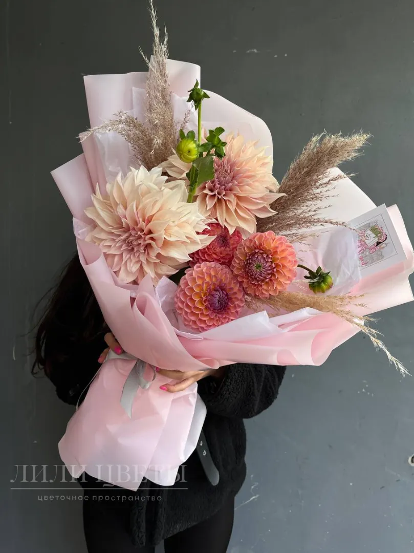 Нежный букет из сезонных георгин не оставит равнодушной ни одну получательницу! Отлично подойдет в подарок на любой повод, а также в виде комплимента без повода. Собираем букеты с большой любовью и теплотой!