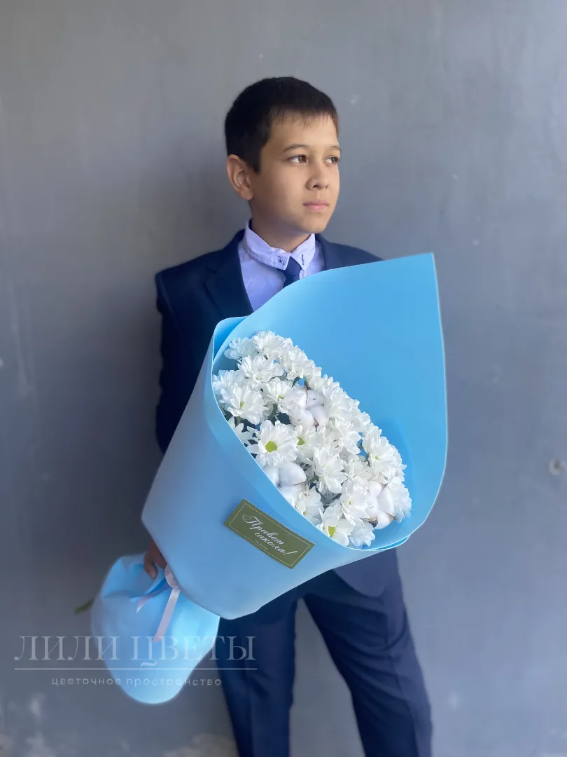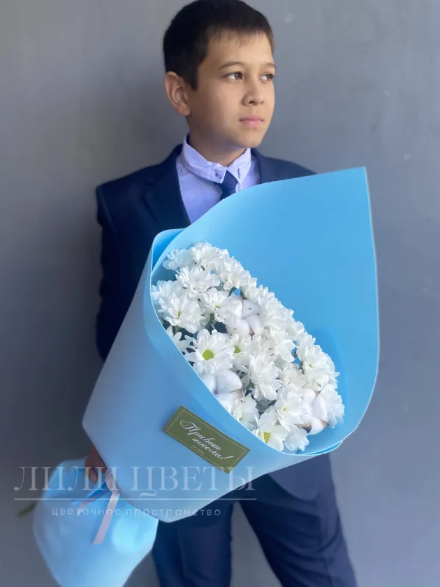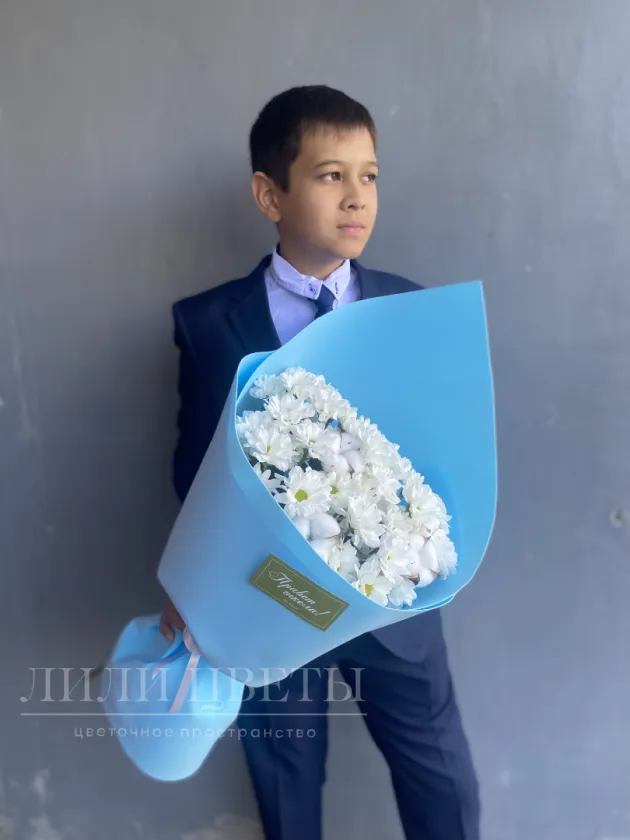 На фото – нежный и стильный монобукет из кустовых хризантем в голубом оформлении. Яркие, сочные цветы, окруженные голубой тканью, создают гармоничный образ, который излучает нежность, легкость и утонченность.