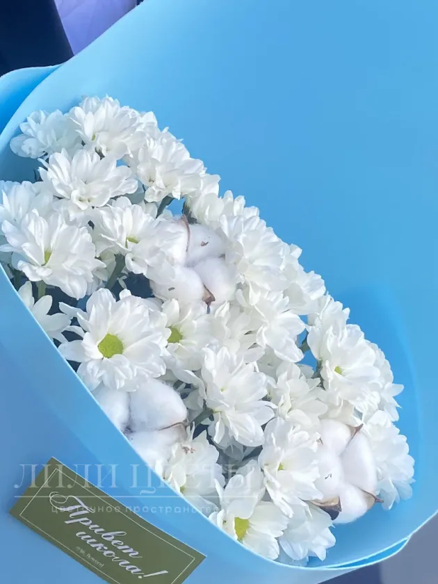 Монобукет из кустовых хризантем в голубом оформление