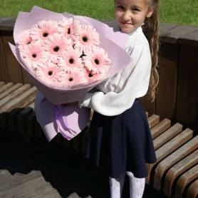 На фото — очаровательный монобукет из нежно-розовых гербер. Эти воздушные цветы, собранные в элегантный букет, излучают романтику, нежность и очарование, создавая атмосферу умиротворения и радости.