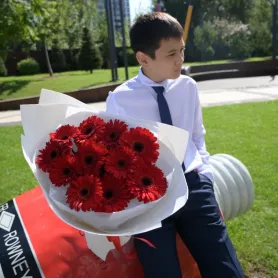 На фото — яркий и страстный монобукет из красных гербер. Сочные, насыщенные цветы, собранные в пышный букет, излучают энергию, страсть и оптимизм, создавая атмосферу праздника и радости.