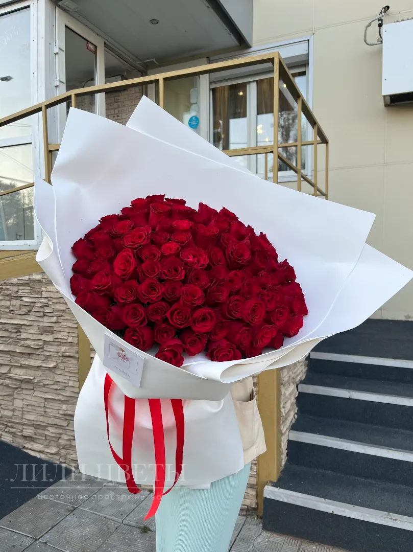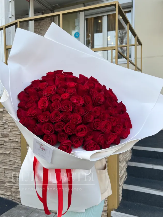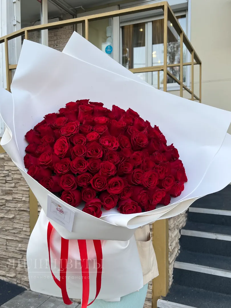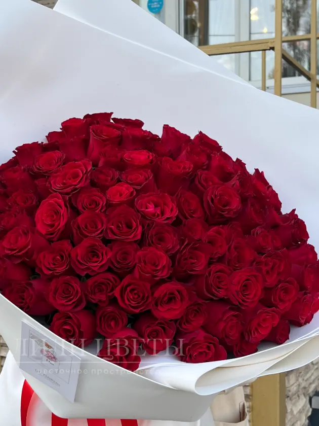 На фото - роскошный монобукет из 101 кенийской розы, настоящий символ любви и страсти. Их бархатные лепестки, собранные в пышный букет, излучают элегантность и роскошь, создавая атмосферу романтики и волшебств.