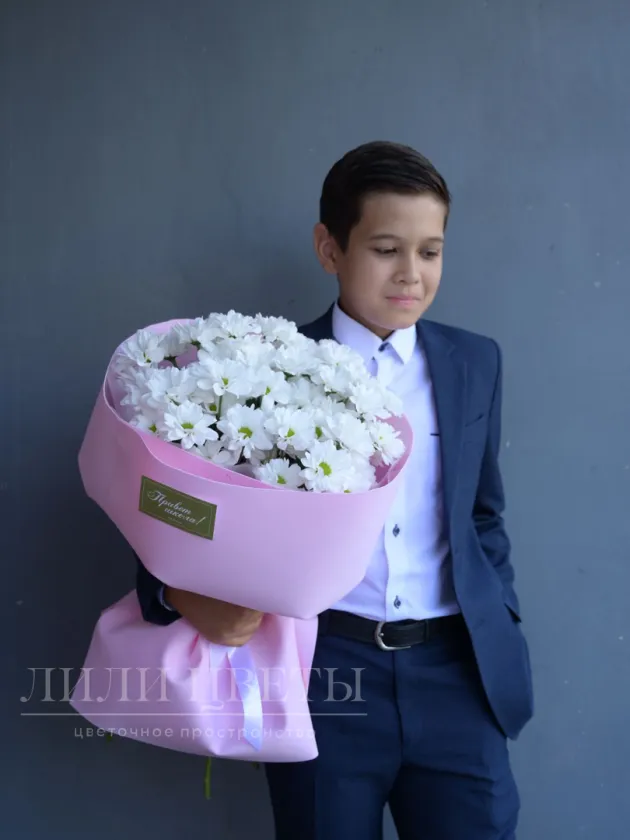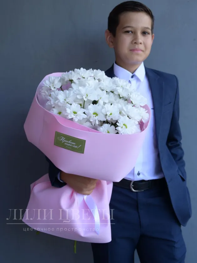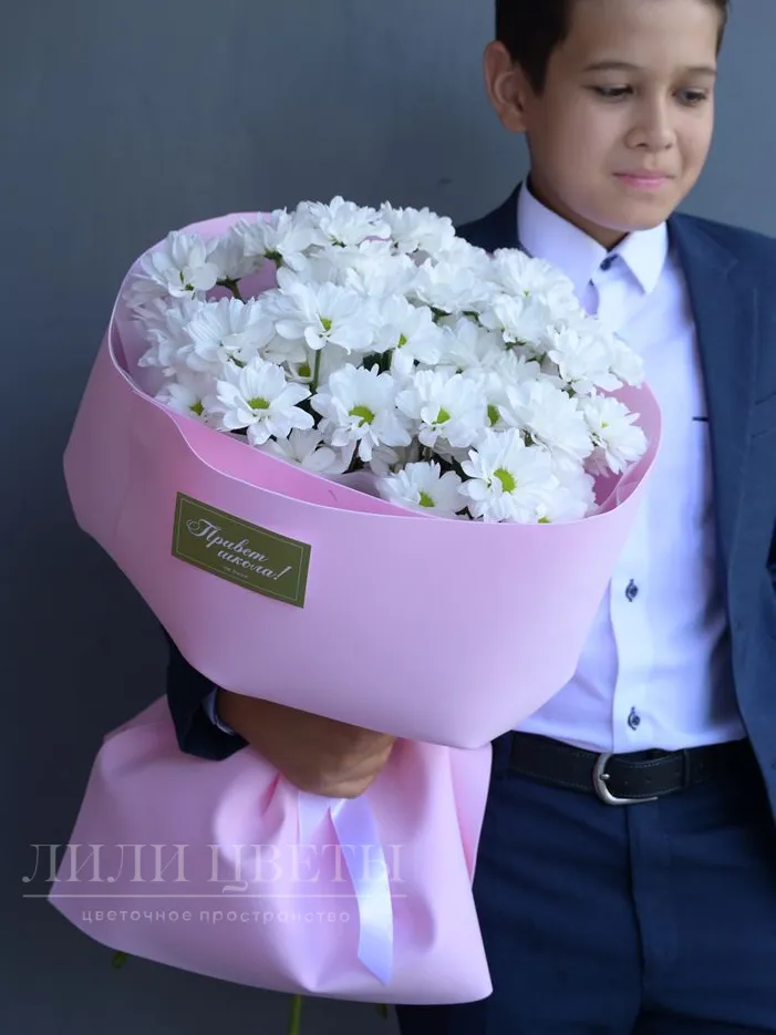 Этот изысканный букет из кустовых хризантем, окутанный нежно-розовой упаковкой, призван внести волшебство в первый день сентября.