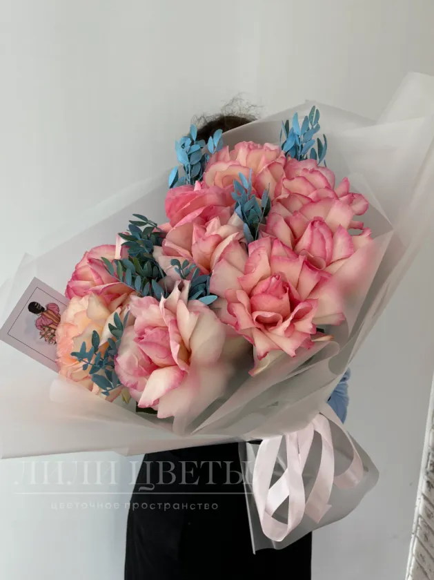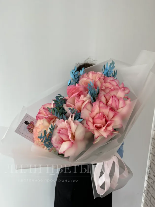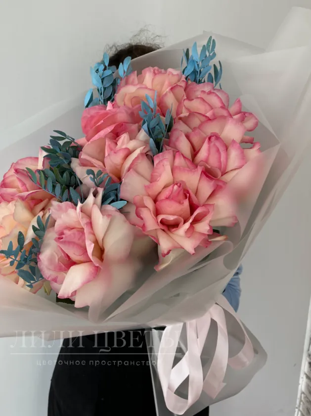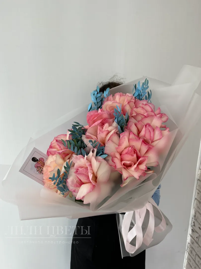 Этот букет из ажурных роз и писташевой зелени — это истинное воплощение нежности и изысканности.