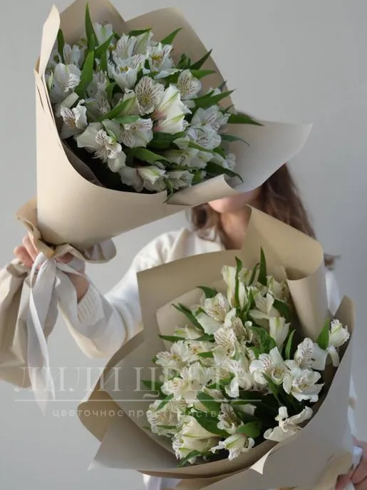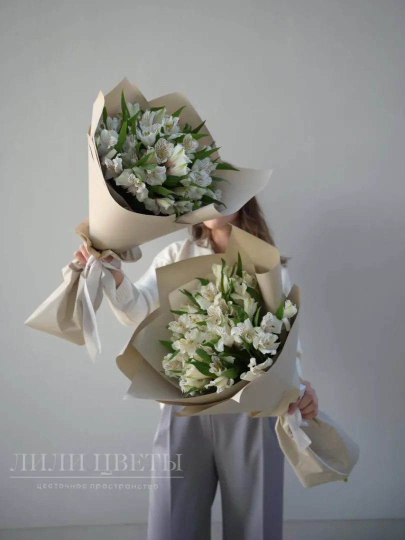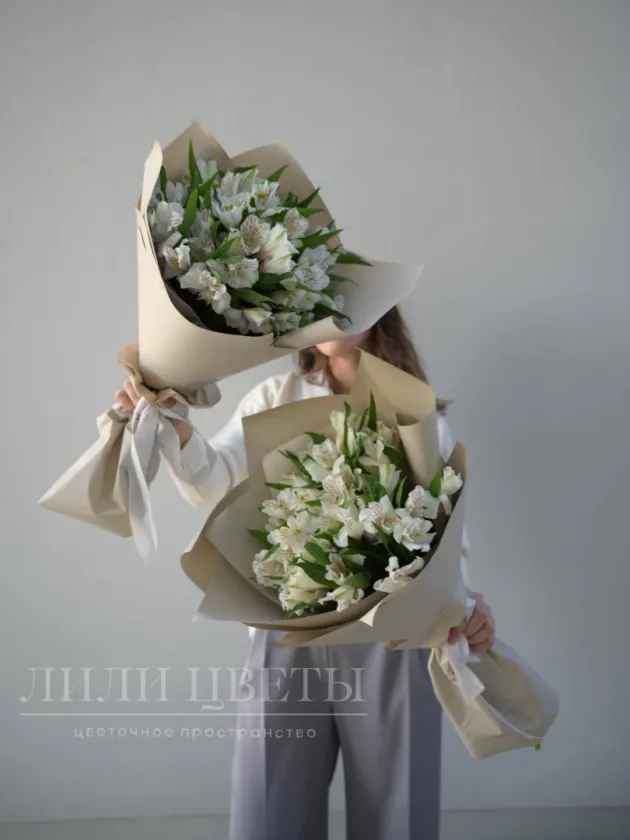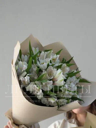 Этот монобукет из нежных белых альстромерий воплощает в себе невероятную чистоту и элегантность.