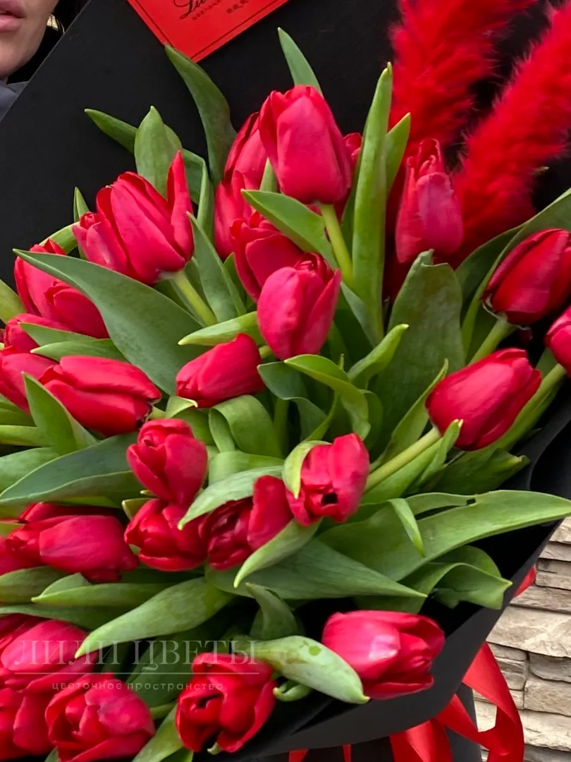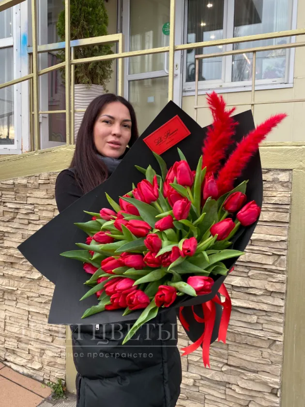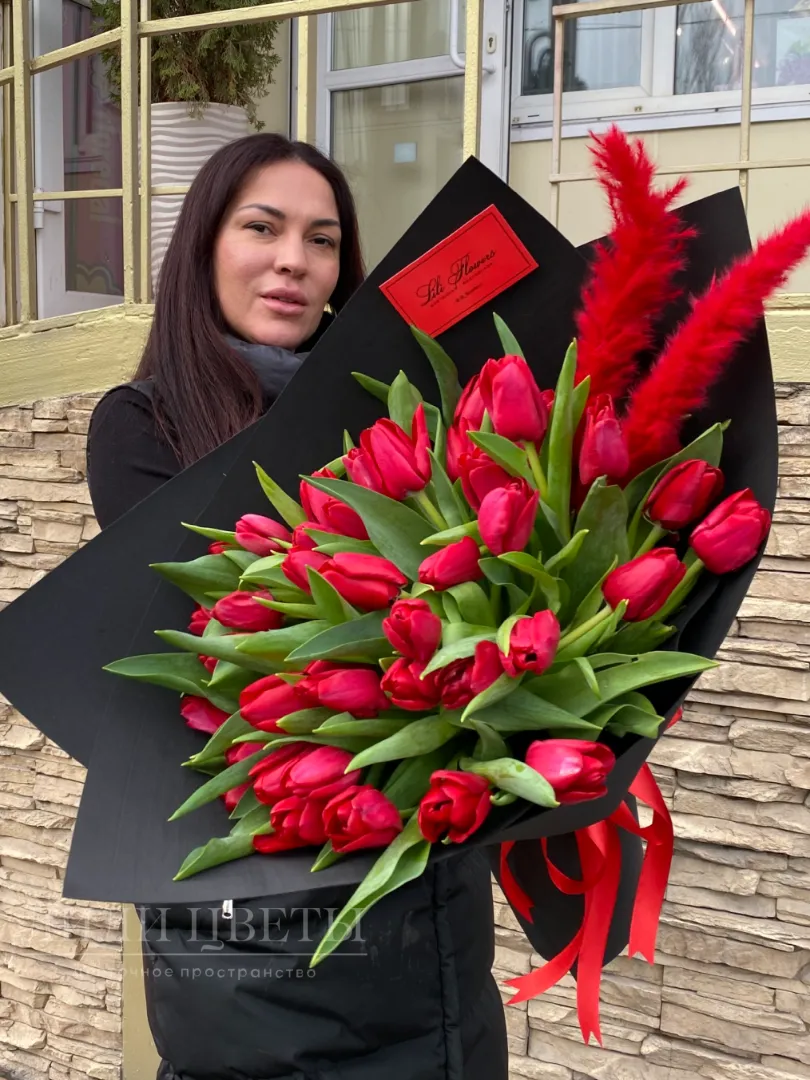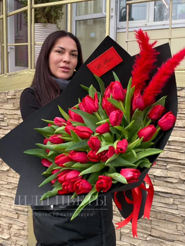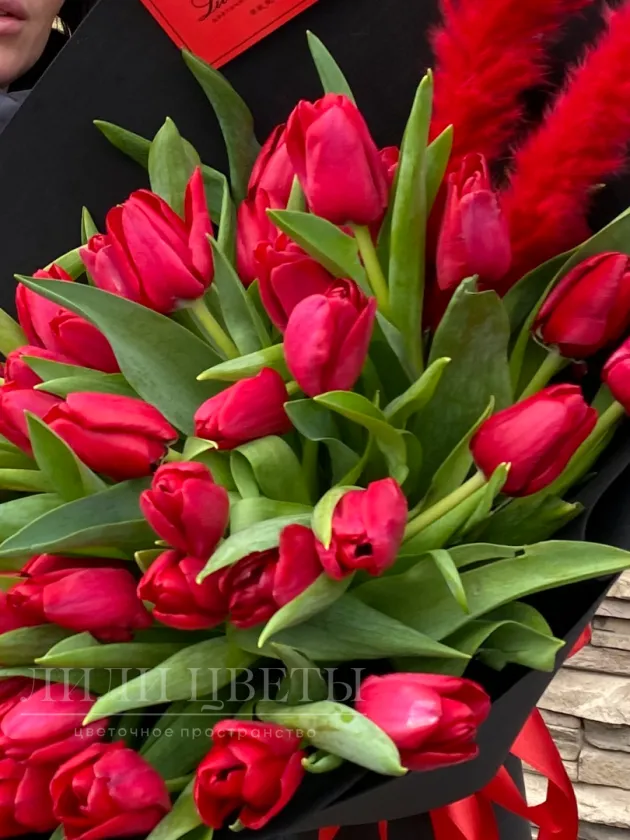 Букет из красных тюльпанов с перьями