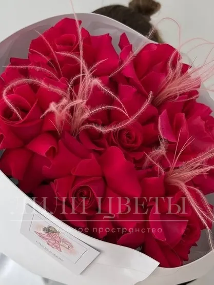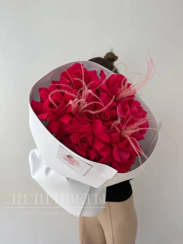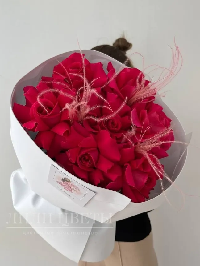 Букет из малиновых роз с ковылём