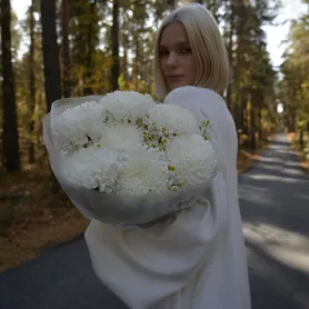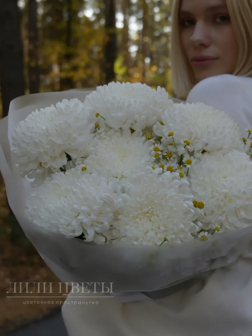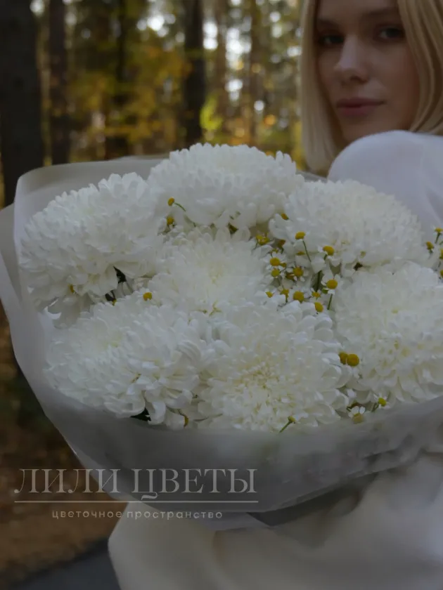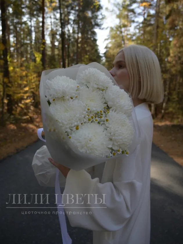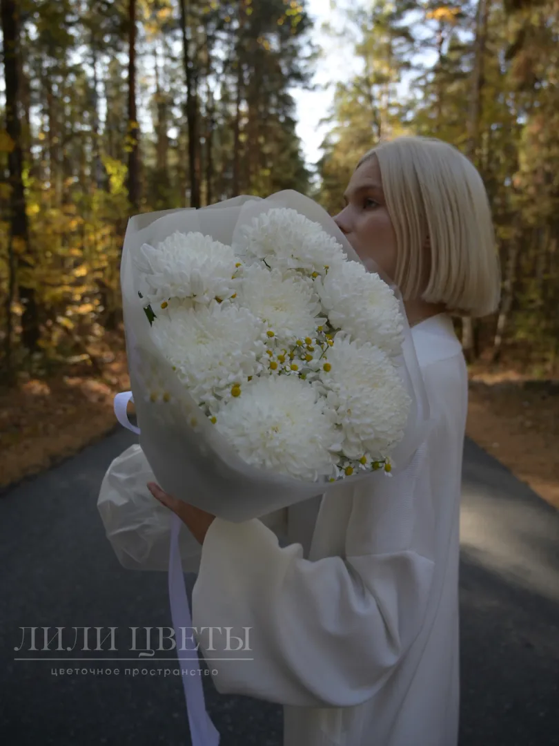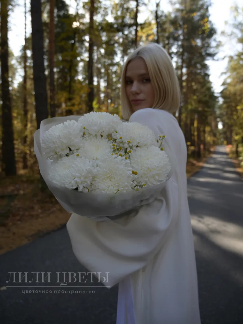 Этот букет из чисто-белых одноголовых хризантем излучает невероятную простоту и изящество.